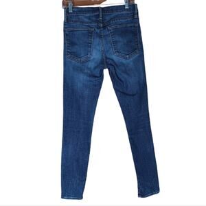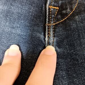 Factory fading and whiskering. High rise, stretchy jeans. Zip and button closure. 5 pocket styling.