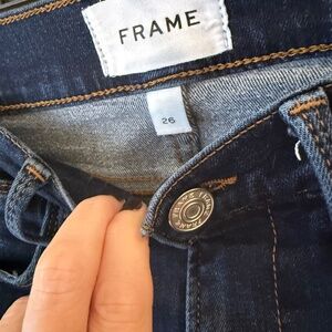 Frame skinny jeans in size 26, mid-rise dark blue color. In good condition.