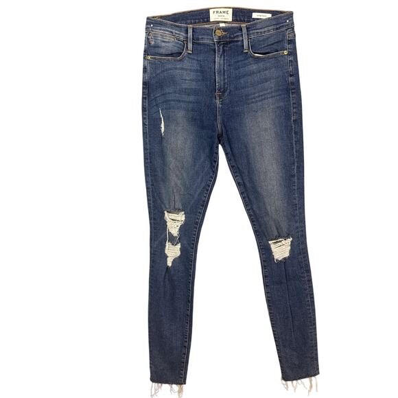 Frame Le' High Skinny Jeans in a distressed medium wash. These Size 28 designer jeans feature a flattering high-rise fit and a touch of stretch for all-day comfort. Perfect for effortless, everyday style.