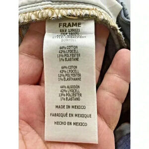 Elevate your denim game with these Frame Le High Skinny Jeans with leather tuxedo piping in size 24. The light wash and solid pattern make them versatile for any season, while the mid-rise fit and 5-pocket design ensure both comfort and functionality. The cotton blend material and stretch feature make them machine washable and easy to care for. The jeans are equipped with both a zip and button closure, as well as accents such as a zipper and button. The Frame Le High Skinny model is a regular fit and has a waist size of 24 inches, with an inseam of 26 inches. These designer jeans are perfect for any woman looking for a stylish and comfortable addition to her wardrobe.