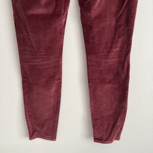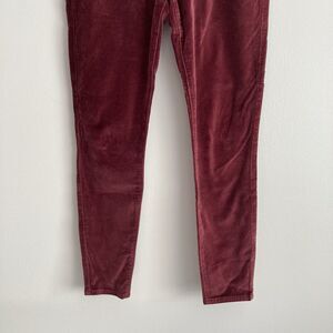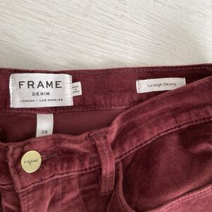 Frame Le High Skinny Velveteen Pants Jeans Womens Size 28 Burgundy Holiday. Frame womens Le High skinny pants. Zipper and button closure. Five pocket design. Cotton and spandex fabric velveteen. Stretchy. Burgundy. Size 28. Measured laying flat: 15.25 inches at waist, 10 inch rise, 27.75 inch inseam.