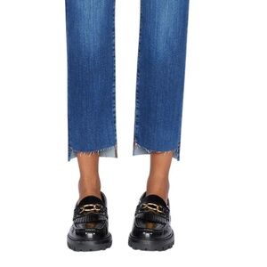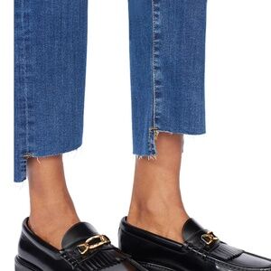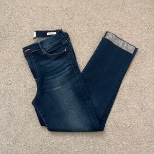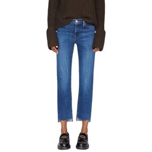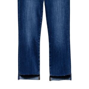 This is a clean, dark blue jean crafted from comfort stretch denim and finished with a raw staggered hem.