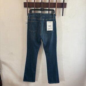 Made from faded mid-wash blue denim with a mid-rise waist, slim-fit thighs and flared calves for a modern style