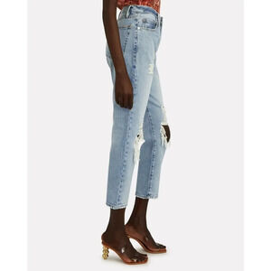 Frame Le Original Jeans in Sunkissed. Size 30. Features high-rise, zip fly with button closure, 5-pocket design, belt loops, slim straight leg, intentionally distressed details throughout, ripped knees, whiskering, fading, ankle crop length, and non-stretch denim. Style LOJ385. 85% Cotton, 15% Re-used Cotton. Excellent condition, no flaws.