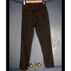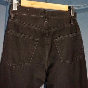 They have a purposeful hole on one knee & fraying on the hip pocket. The color is a true dark black called “banister road.”
