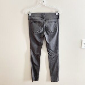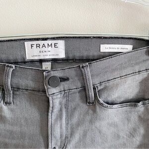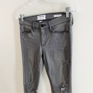 Frame. Size 27. Gray skinny jeans with intentional distressing. Waist 13.5” rise 8” inseam 28.5.” Excellent condition, no flaws. D