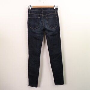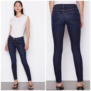Frame's classic skinny in deep dark blue wash. Crafted from premium denim with strong recovery and super stretch. Mid rise skinny fit.