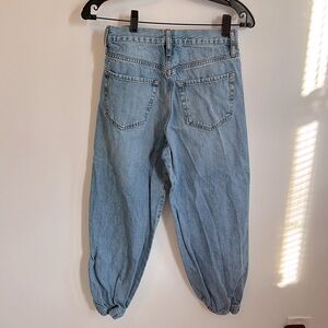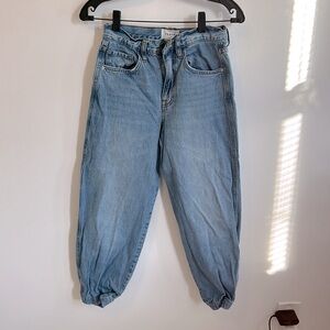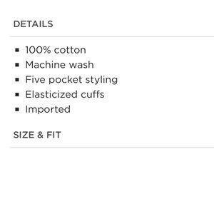 Non stretch denim joggers. Belt loops and five pocket styling. Zip fly, Elastic cuffs.