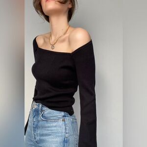 Frame Sweater NWT Silk Blend Bell Sleeve Square Neck Rib Knit Fitted Black size Small