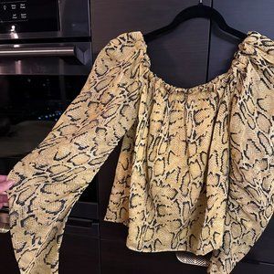 Frame Yellow Python Snake Reptile Multi Print Off The Shoulder Billow Top Women's size Small. This long sleeve top features a bold python print design, offering a modern staple to your closet style.