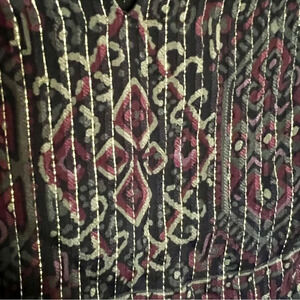 In blacks, moss green and dark red colors with metallic gold thread in a silk chiffon fabric.