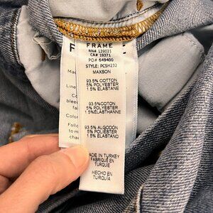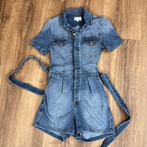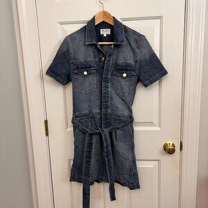 Frame Maxson Pleated Light Wash Denim Romper. Belted coverall shorts playsuit. Adorable and trendy!