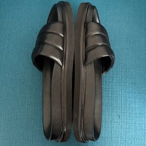 Frame noir leather slides in size 41 (mens 8 1/2 or women’s 10). Padded lambskin band with subtle stamp, molded footbed with rim, 1/2” platform. Very nice condition.