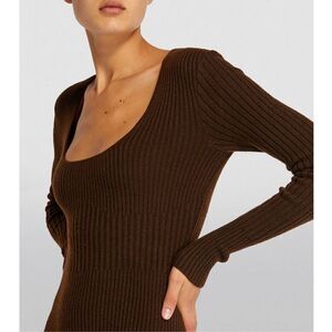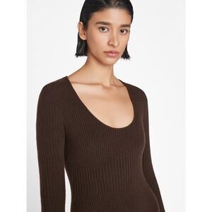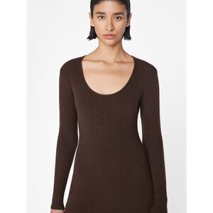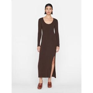 $898 NWT Frame Ribbed Cashmere U-Neck Dress in Espresso. Size Medium. A body-hugging midi dress with feminine u-neckline, long sleeves, Banded waist - subtle corset details, and a deep single leg slit. Pulls over. Crafted from an ultra-soft, ribbed cashmere blend with slight stretch for a smooth, blanket-like finish. 87% cashmere/12% nylon/1% spandex. Dry clean. Trendy dress. Must have for cold season. Sold out everywhere.
