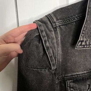 featuring a faded black and gray wash that gives it a trendy, worn-in look. This jacket is designed with classic denim jacket elements like a pointed collar, button-down front, and chest pockets with buttoned flaps. A unique design features subtle puff sleeve detailing at the shoulders adding a touch of modern flair. The jacket also includes side pockets and a straight hem. Its versatile color and design make it a perfect layering piece for various outfits.