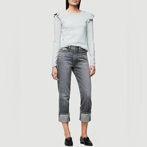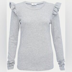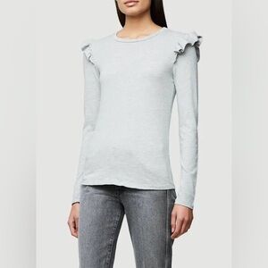 NWT Frame Ruffle Crewneck Long Sleeve Cotton Top in Gray Size XS, soft heathered gray l/s tee with ruffles at the shoulders, 17.5” PTP, 25” length, 92% cotton, 8% polyester, brand new condition, smoke free home