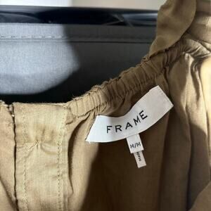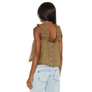 Frame Ruffle Strap Tank in Moss. Size M / Medium. Features square neckline, sleeveless, elastic shoulder straps with ruffle trim, back button closure, and side hem slits. Style LWSH2301. Self: 100% ramie. Lining: 100% cotton. Excellent condition, no flaws.