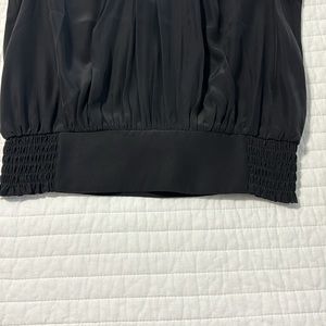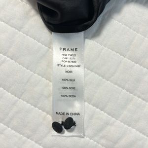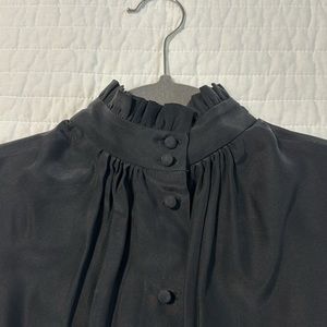 Frame blouse with smocked detail at waistline. Button front and short ruffled sleeves. 100% black silk. Brand new with tag.