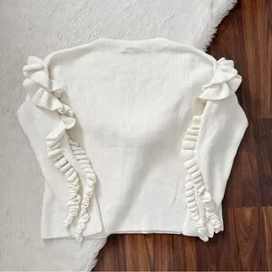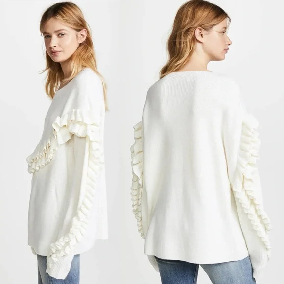 A mixture of knit stitches and a winding stripe of ruffles add playful texture to this ivory-hued sweater knit in a cozy wool blend.