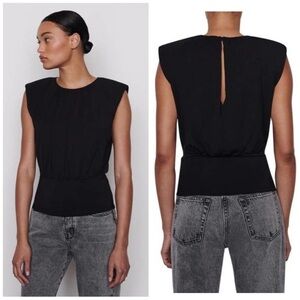 Padded shoulders, back keyhole with button closure, fitted waist, shirred round neckline, solid black. Modal, spandex blend. Casual, work, business casual, evening, night out.