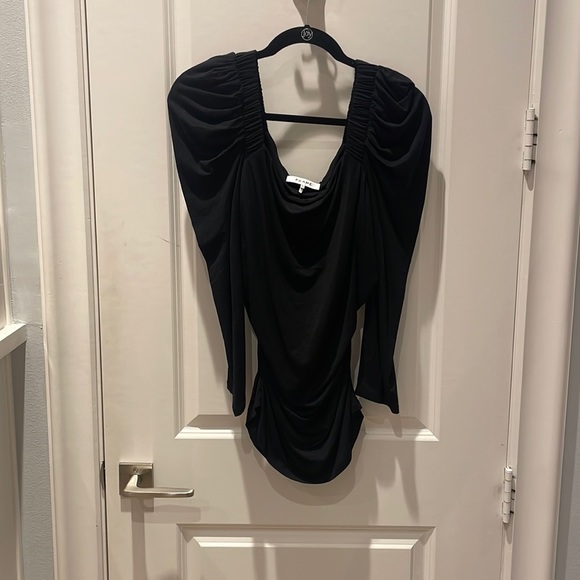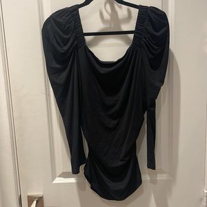 Puff shoulders, ruched sides, flattering and comfortable fabric. Like new.