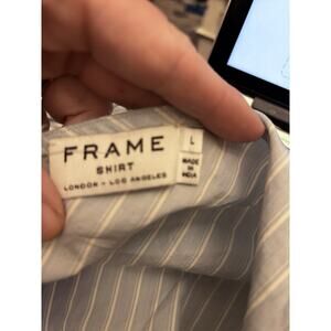 The Frame Shirt Top for women in size L is a stylish blue blouse with white stripes, perfect for work or casual occasions. Made of cotton, this lightweight and breathable top features a crew neck, button closure, and flared sleeves for a trendy look. With a regular fit and a hip length, this blouse from the brand Frame is a versatile addition to any wardrobe, suitable for wearing in summer, fall, or spring. Unique feature of buttoning in the back.