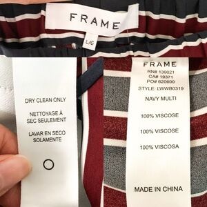 “Boudoir inspired, FRAME looks to uniform dressing with the Side Slit Easy Pant. Cut from luxurious satin, the high-rise trousers are transformed via bold vertical stripes and a relaxed fit.”