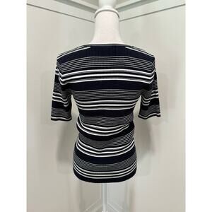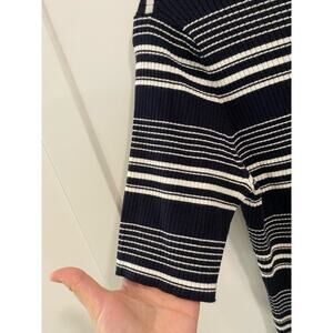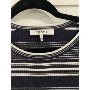 Frame Top Size L. Perfect high end basic. Really nice 72/28 rayon/poly blend ribbed fabric. Navy blue. No obvious flaws or signs of wear.