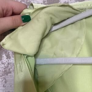 Gorgeous mini dress from Frame! Features mini length, button up front, invisible zipper on the side of the waist, silk and spandex fabric, pale celery green color called "Bright Peridot", extra long cuff with button closure, and shoulder pads.