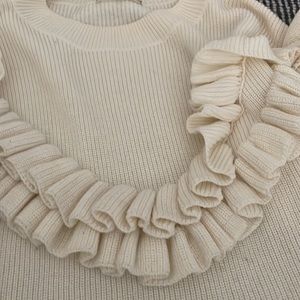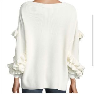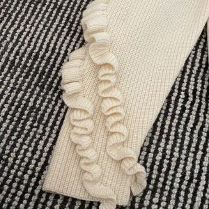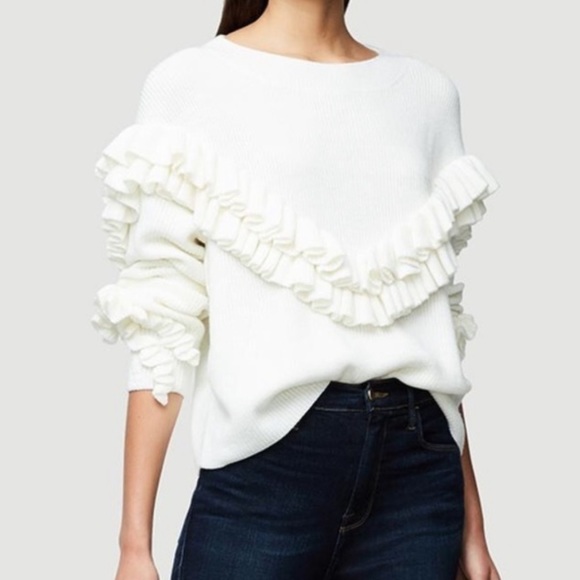 FRAME elegant ribbed knit sweater with ruffled yoke and sleeves. Wide bateau neckline. Long sleeves. Slouchy fit. Straight hem hits below seat. Pullover off white 50% Merino 50% acrylic. Comfy, cozy elegant and warm. Bottom is even around the entire sweater.