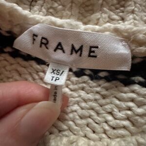 White Frame cotton sweater with black stripes. Looks great with high-waisted pants and skirts. Warm and comfortable. Worn lightly and looks like new. Dry clean only.