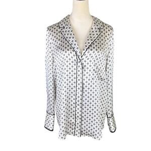 Frame White & Black Print Satin 100% Silk Button Front Long Sleeve Pajama Shirt