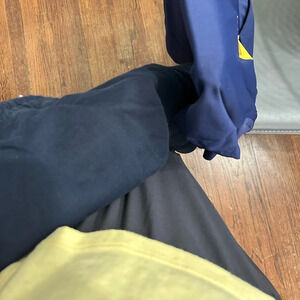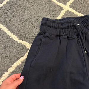 Worn once. In perfect condition. Amazing material. Pockets. Drawstring with metal detail. Show the dark navy color next to navy and black.