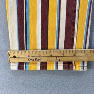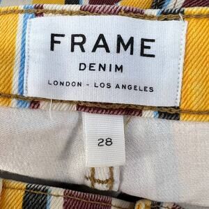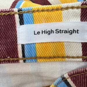 Frame Women's Le High Straight Painterly Stripe Jeans. Tagged women's size 28 (6). Horizontal, multicolored stripes. Blue, burgundy, yellow, black, and white stripes. In great preowned condition with minimal signs of wear. Straight style denim jeans.