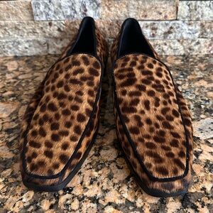 A loafer featuring a square apron toe is done in genuine calf hair, lending an extraluxe quality to the minimalist style.