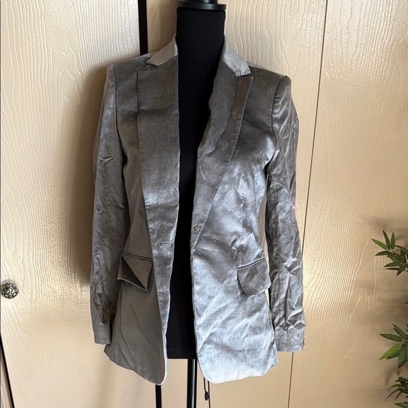Elevate your style with this chic silver blazer. Perfect for any occasion, it adds a touch of elegance to your wardrobe. Missing front button but that’s an easy fix. Inside lining is spotless.