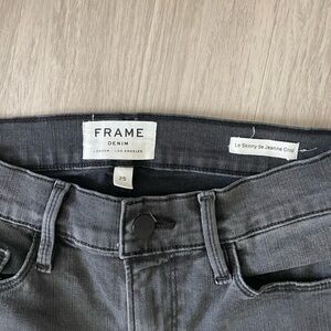 Elevate your denim game with these Frame Le Skinny de Jeanne crop jeans in a size 25. The distressed and frayed asymmetrical cut adds a trendy edge to this classic silhouette. Made by the renowned brand Frame, these jeans are crafted with high-quality materials for a comfortable and flattering fit. The cropped length is perfect for showing off your favorite shoes, while the distressed details give them a cool, lived-in look. Pair them with a simple tee and sneakers for a casual weekend outfit, or dress them up with heels and a blouse for a night out. These jeans are pre-loved but in great condition, ready to become a staple in your wardrobe. Don't miss out on adding these stylish jeans to your collection!