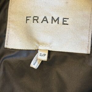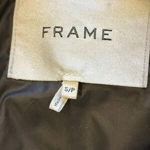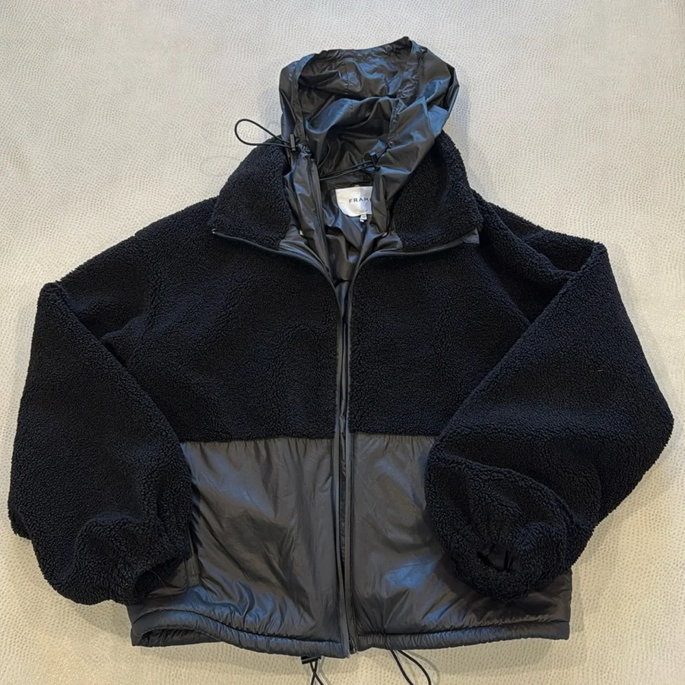 This is a Frame black teddy / puffer hybrid jacket with button out lining with zipper . Drawstring waist and hood attached to lining . Great midweight . No rips , or stains