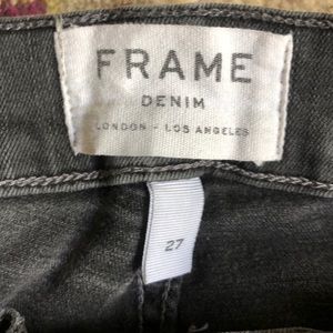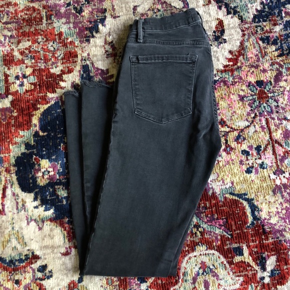 Super cute Frame denim. Wash is soft black, frayed split hem, skinny with stretch. These jeans are rad, they just don’t fit me.