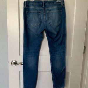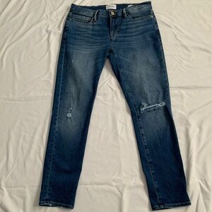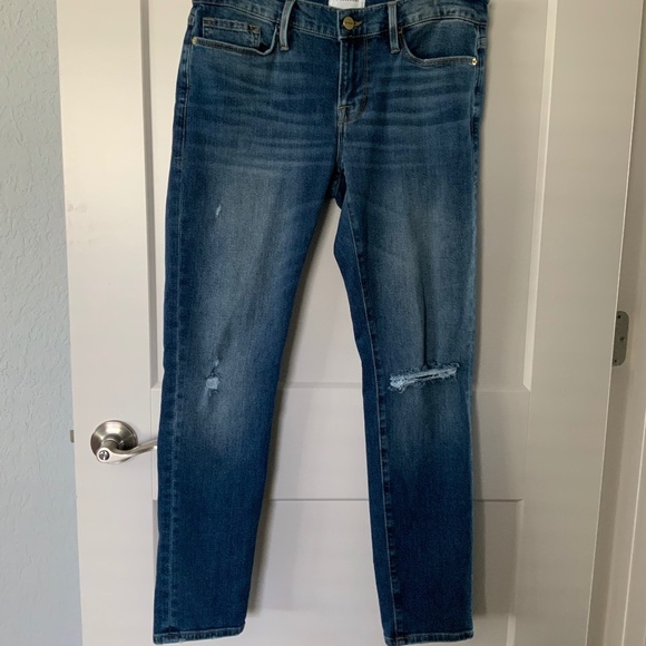 Frame blue denim jeans. Boyfriend. Mid-rise, distressed detail. Size 26.(2/4US) Very good previously loved condition; minor wear on fabric.