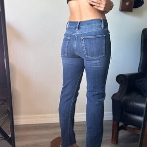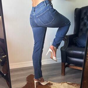 Premium FRAME denim in a dark wash with a raw hem and flattering high-rise fit. The “Le High Straight” cut gives that perfect straight-leg shape without being too wide or too skinny — super flattering on the booty, with just the right amount of stretch.