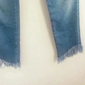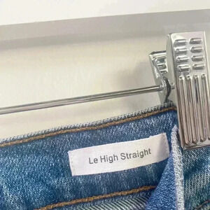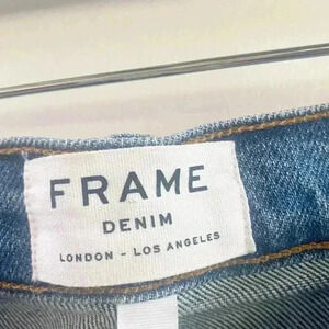 Frame le high straight jeans in classic blue wash with frayed hem. Size 24. Excellent used condition