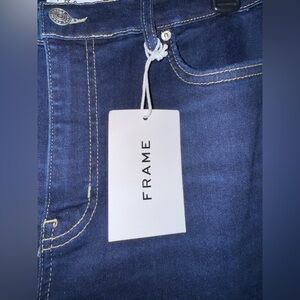 Classic Frame dark blue denim jeans. Features back pockets and contrast stitching. Perfect for casual wear. Super comfortable!