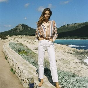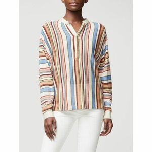 Break from basic knitwear with this Henley ligh weight sweater in a sun-soaked stripe pattern with a mandarin collar with scrunchable sleeves