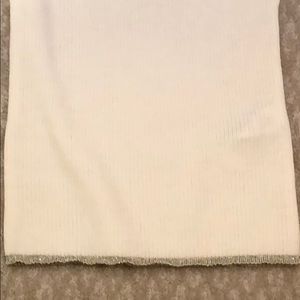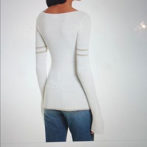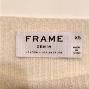 Frame metallic knit merino wool blend sweater. Vintage varsity gets a new shine on this finely ribbed sweater sparkling with metallic stripes on sleeves and along the bottom. Never worn. Size xs