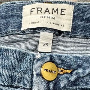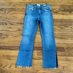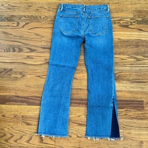 Excellent condition Frame Le Crop Mini Boot Jeans. Size 28. Fringed legs, boot cut. Legs have been professionally altered to display contrasting dark blue leg panel (original material) at leg bottom. No stains or damage. From smoke free pet free home. Measurements laying flat: