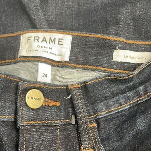 Frame jeans in a size 24, with gold hardware in a dark blue. Lightly worn and in great condition.