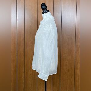 Frame’s Gillian metallic blouse is crafted of a silk blend, complete with a mock turtleneck and fitted sleeves.