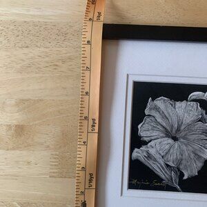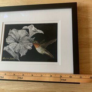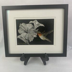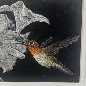Framed Art Painting Moody Floral Hummingbird Flowers Scratchboard Small Folk Art