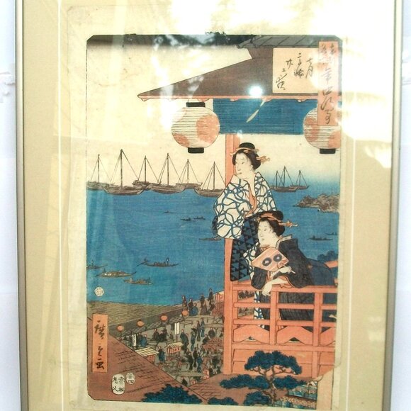 An original authenticated appraised ($300 in 20-20) limited-edition 1854 print from Japanese artist Utagawa Hiroshige's (1797-1858) print-series "Series of Annual Events of Famous Places of the Eastern Capital." Authenticated and appraised by Mita Arts Gallery in Tokyo in 2020 print was done in April 1854. The print is un-numbered and is titled "The Seventh Month, the Twenty-Sixth Night, Takanawa. It depicts beauties on the deck of the Takanawa Teahouse in Spring 1854. Print measures 14.75" high x 9.75" across. Frame measures 18.5" x 13.5" x 1". Condition is of course more than 160 years old. Print-paper under-glass shows wear at top and an anomaly at bottom-right. All shown in the pictures. Frame-backing has some nicks. Please study the pictures up close - enlarging on devices.